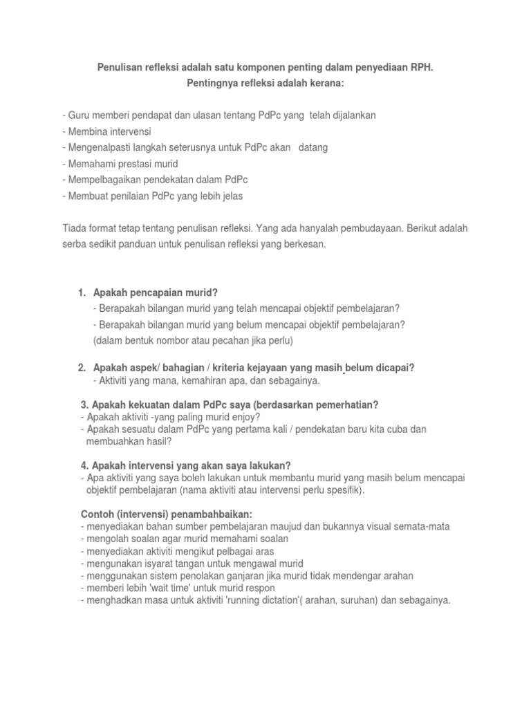 Panduan Contoh Penulisan Impak Refleksi Dalam Rph Pdf