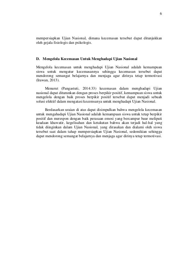 Kondisi psikologis siswa bermacam-macam dalam menghadapi Ujian Nasional hal ini disebabkan adanya dinamika psikis yang berbeda-beda dalam diri siswa. Jurnal Psikologi 11 1 46-54 2018. Siswa yang dinamika psikisnya baik tidak mengalami kecemasan atau ketakutan dalam.